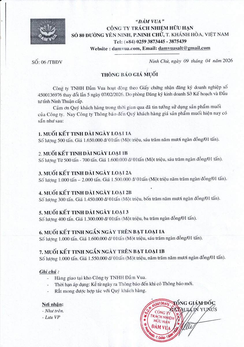 * Lưu ý: Từ ngày 01/08/2025 giá muối của Công ty Đầm Vua sẽ tăng.